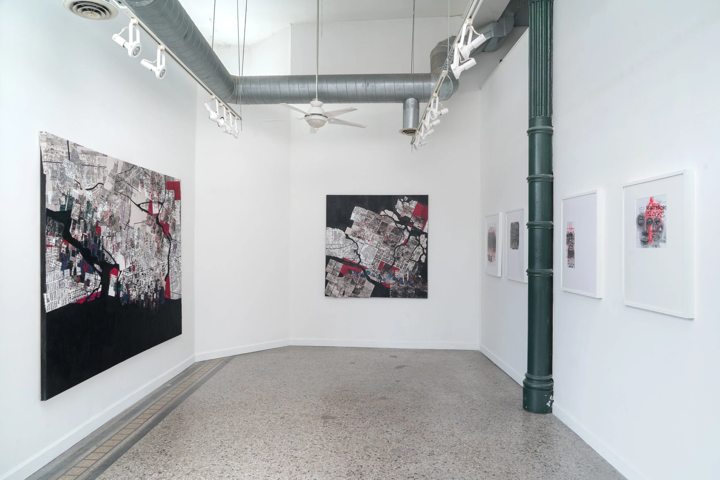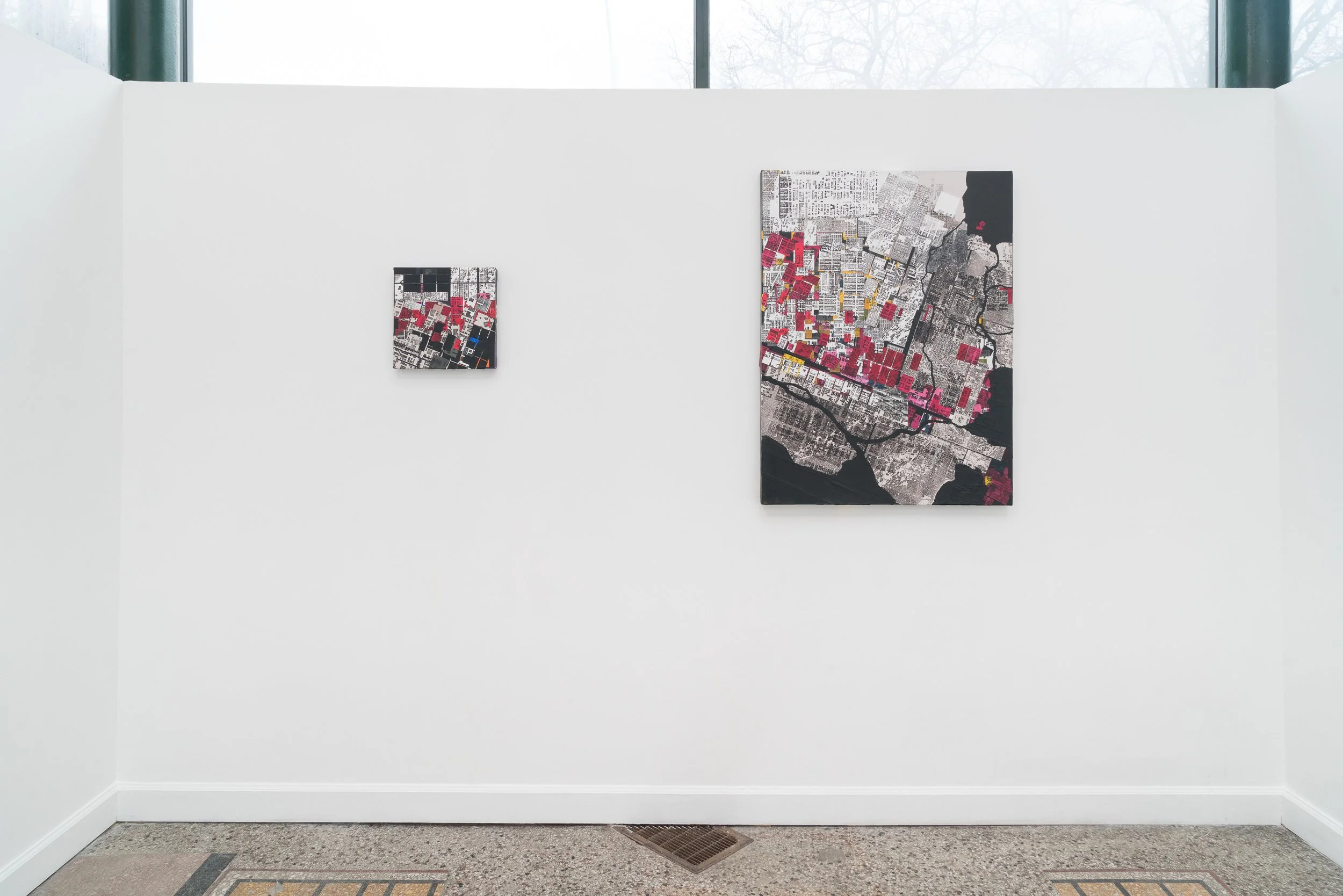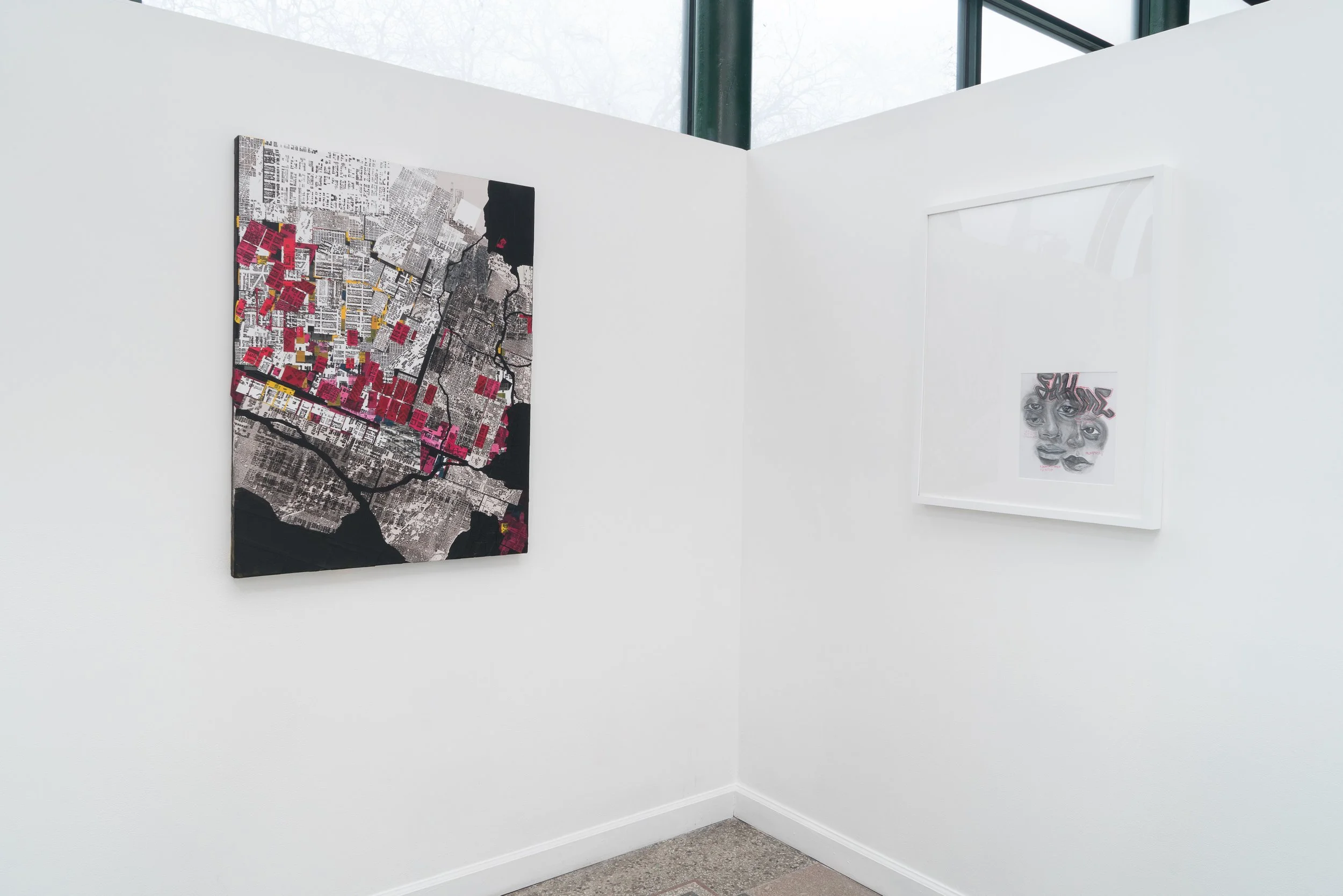 Buried Beauty, Broken Block is an exhibition of works by two artists, who together span notions of black spatiality across two scales. From the micro, intimate features of the body, to the macro systems of a cityscape. The works in the show collage these elements through painting and drawing, to externalize the layered, yet often invisible tensions that exist between the black body and the spaces in which these two artists occupy.