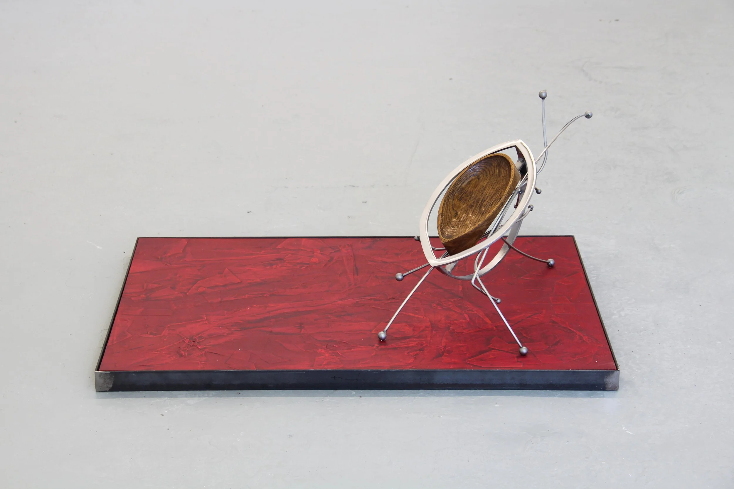 Steel, Hand-Carved Oak, Resin, Cowrie Shells, Binder Clips, and Torched Acrylic on Linen